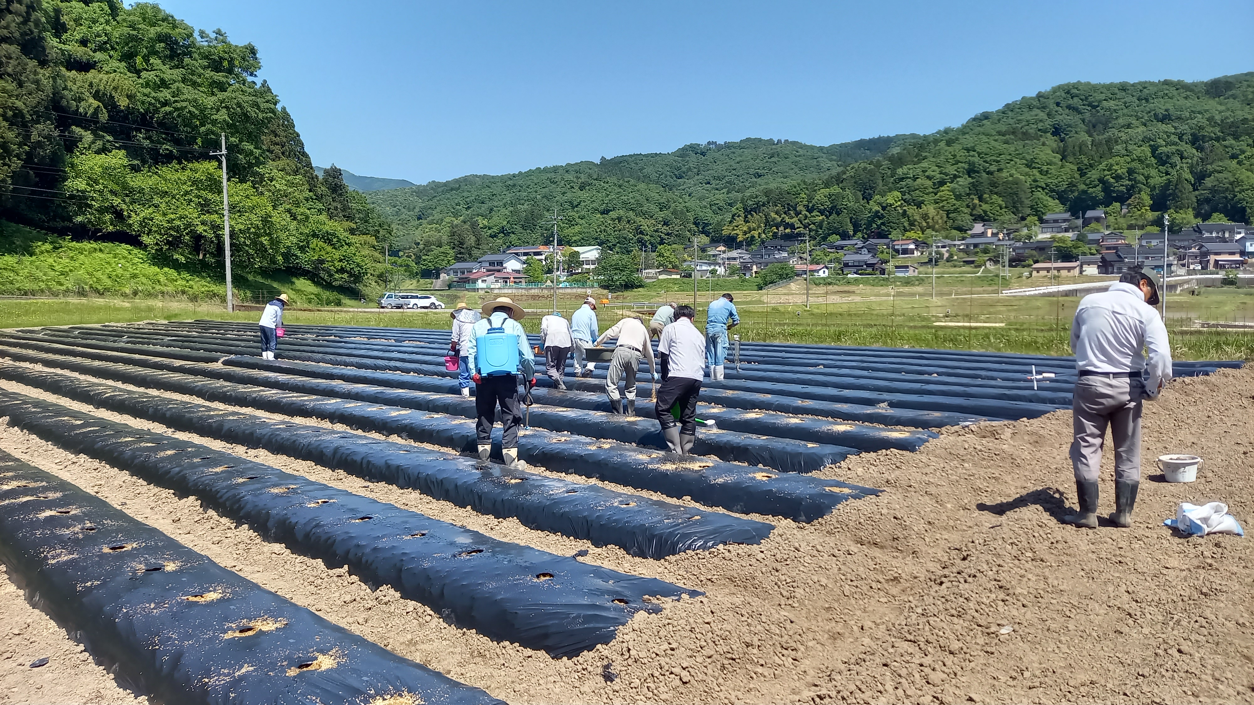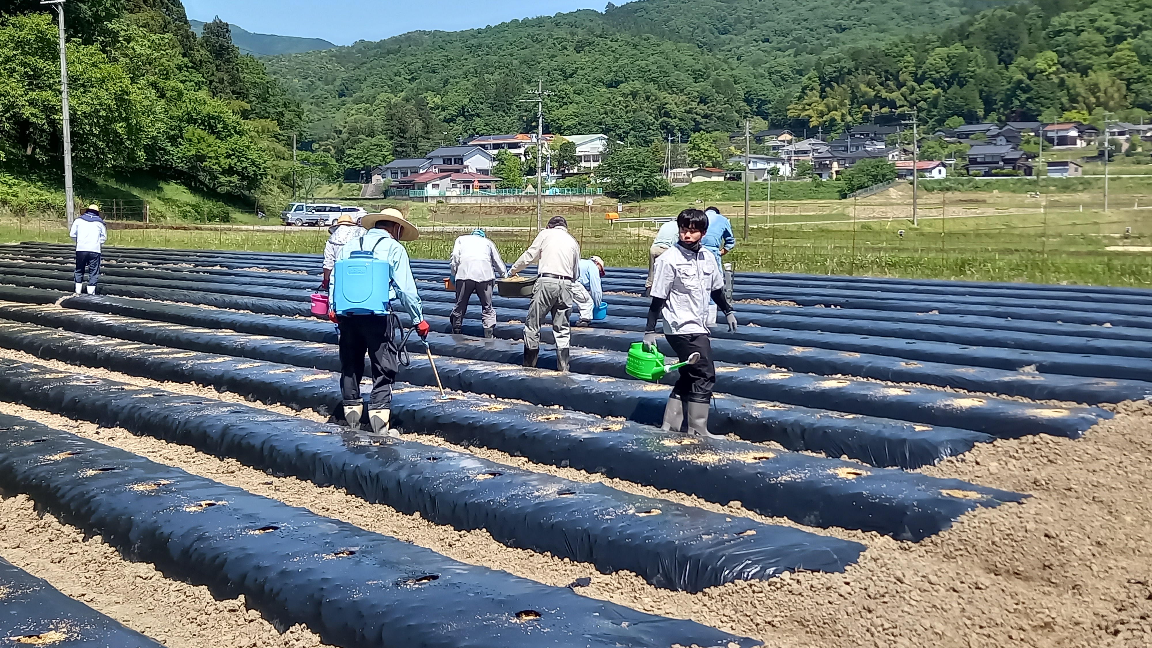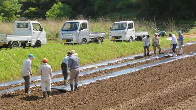 令和6年5月11日八代オクラ畑マルチ張り(毎年苦労します)・5月18日八代オクラ種蒔き(腰が痛い)
